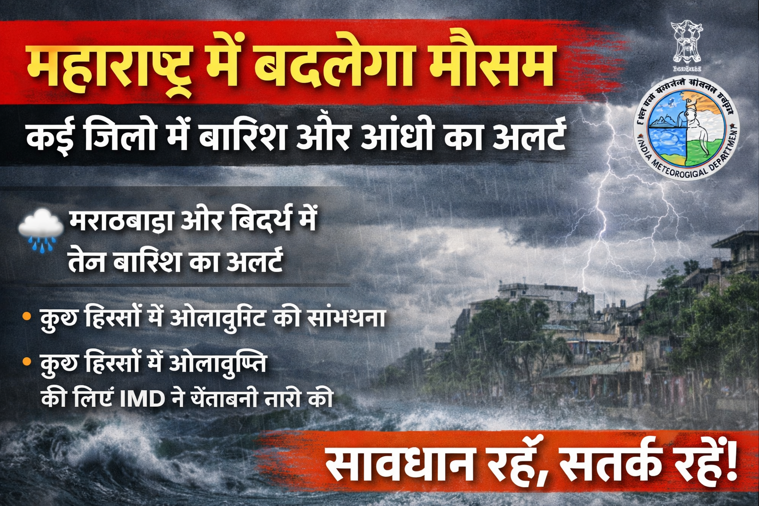 рдорд╣рд╛рд░рд╛рд╖реНрдЯреНрд░ рдореЗрдВ рдореМрд╕рдо рдХреЛ рд▓реЗрдХрд░ рдмрдбрд╝рд╛ рдЕрдкрдбреЗрдЯ рд╕рд╛рдордиреЗ рдЖрдпрд╛ рд╣реИред India Meteorological Department (IMD) рдиреЗ рд░рд╛рдЬреНрдп рдХреЗ рдХрдИ рд╣рд┐рд╕реНрд╕реЛрдВ рдореЗрдВ рдЖрдиреЗ рд╡рд╛рд▓реЗ рджрд┐рдиреЛрдВ рдореЗрдВ рдмрд╛рд░рд┐рд╢ рдФрд░ рдЖрдВрдзреА-рддреВрдлрд╛рди рдХреА рдЪреЗрддрд╛рд╡рдиреА рдЬрд╛рд░реА рдХреА рд╣реИред