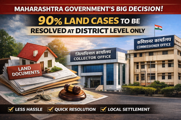 рдорд╣рд╛рд░рд╛рд╖реНрдЯреНрд░ рд╕рд░рдХрд╛рд░ рдиреЗ рдЬрдореАрди рд╕реЗ рдЬреБрдбрд╝реЗ рдорд╛рдорд▓реЛрдВ рдореЗрдВ рдмрдбрд╝рд╛ рдФрд░ рдЕрд╣рдо рдлреИрд╕рд▓рд╛ рд▓рд┐рдпрд╛ рд╣реИред рдЕрдм рд░рд╛рдЬреНрдп рдореЗрдВ рд▓реИрдВрдб рд░реЗрдЧреБрд▓рд░рд╛рдЗрдЬреЗрд╢рди (Land Regularisation) рдХреЗ рдХрд░реАрдм 90% рдорд╛рдорд▓реЛрдВ рдХрд╛ рдирд┐рдкрдЯрд╛рд░рд╛ рдЬрд┐рд▓рд╛ рд╕реНрддрд░ рдкрд░ рд╣реА рдХрд┐рдпрд╛ рдЬрд╛рдПрдЧрд╛ред